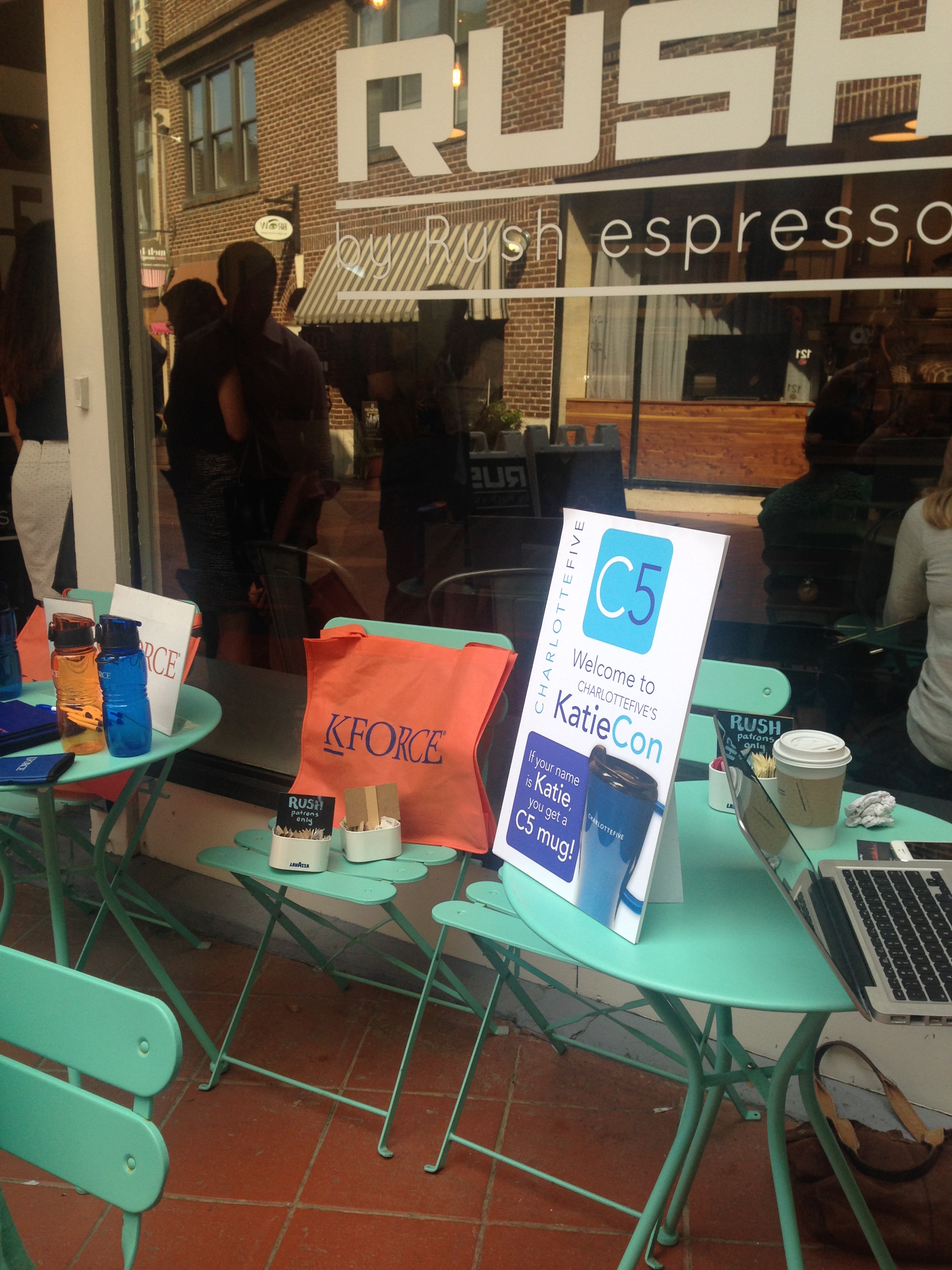 So this morning I, evidently a prominent Charlotte Kaite, made my way to KatieCon, held at an awesome little coffeeshop in Charlotte called Rush. I had coffee with some Katies I knew, and a few that I didn’t. Overall it was a cool event with an excuse to leave the office, and I got a cool new sparkly mug to go with all the other ones lining my desk at the moment. I was proud to have captured the ironic moment that KForce decided to set up for a meeting right next to the KatieCon set up. It was magical.