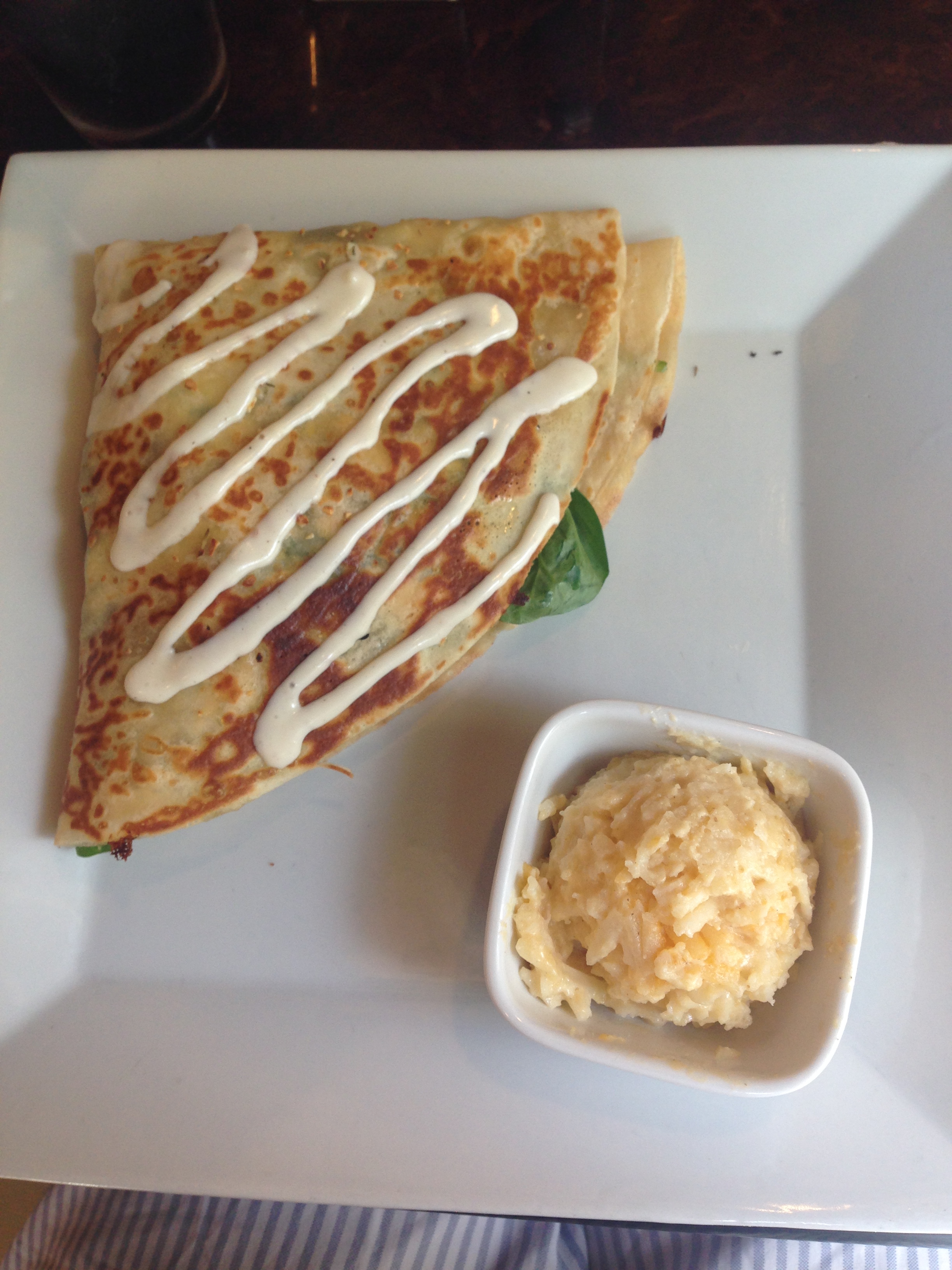 I took a celebratory Friday lunch break with our new Carolina Bride editor at Crispy Crepe in South End. I had never been to this restaurant, but I’ve had and made crepes before. This particular one is filled with grilled chicken, bechamel, spinach, and goat cheese, served au gratin potatoes. It was super filling and delicious. There should be more repurposed breakfast materials for savory dishes.